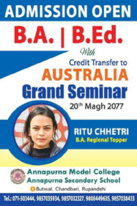 अष्ट्रेलिया क्रेडिट ट्रान्सफर हुने गरी अन्नपुर्ण मोडल कलेजमा शैक्षिक शत्र २०७७÷०७८को लागी वि.ए प्रथम वर्षमा भर्ना खुलेको कलेजले जनाएको छ ।