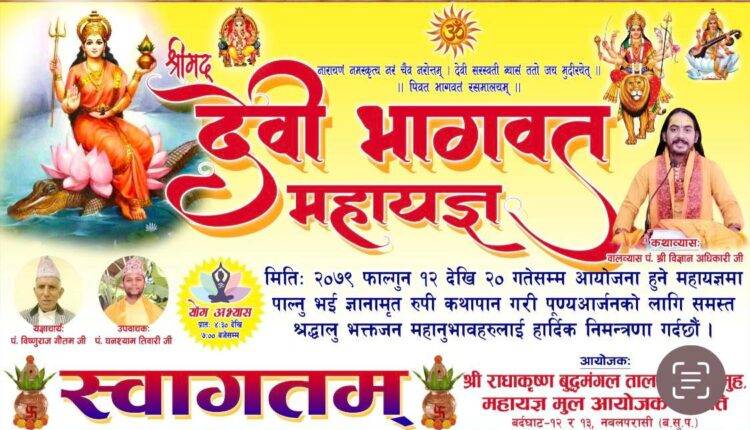 ९ दिन सम्म सञ्चालन हुने महायज्ञमा बालब्यास पण्डीत श्री बिज्ञान अधिकारीले देवी भागवत महापुराणमा कथा बाचन गर्ने कार्यक्रम रहेको आयोजक समिति अध्यक्ष पाठकले जानकारी दिनुभयो ।