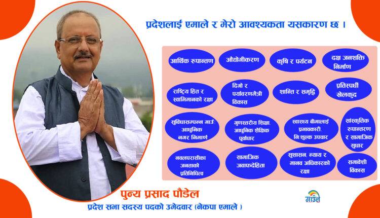अब आगामि मंसिर ४ गते जनताले फेरी छैटौँ पटक अर्थात संघ र प्रदेश सभा निर्वाचनका लागि दोस्रो पटक मतदान गर्दैछन् । लुम्बिनी प्रदेशका लागि नवलपरासी निर्वाचन क्षेत्र नं. १ ( क) वाट यस बर्ष १६ जनाले उमेदवारी दिएका छन जस्मध्ये नेकपा एमालेले यसपटक पुण्य प्रसाद पौडेललाई अघि सारेको छ । सामाजिक तथा राजनितिक क्षेत्रमा जल्दा बल्दा ब्यक्तित्वका रुपमा आफुलाई स्थापित गर्न सफल भएका पुण्य प्रसाद पौडेल यतिवेला आफ्नो पार्टीको चुनावी एजेण्डा सहित आफ्ना नयां योजनाहरु लिएर आफ्ना मतदाताहरुको घरदैलोमा पुगी रहनु भएको छ । यसैक्रममा हामीले उहाँसंग केहि जिज्ञासाहरु राखेका थियौं । प्रस्तुत् छ प्रदेश सभा सदस्य पदका उमेदवार पौडेलसंग राखीएका जिज्ञासा र त्यसको जस्ताको जस्तै प्रतिउत्तर ः सम्पादक