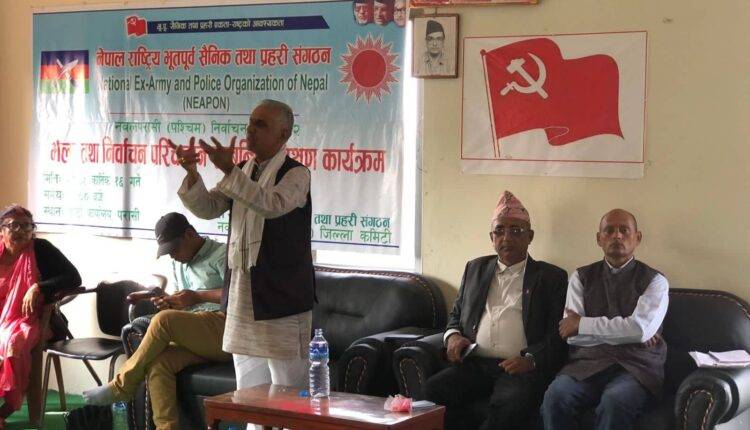 नेपाल राष्ट्रिय भूतपूर्व सैनिक तथा प्रहरी संगठन जिल्ला कमिटीका अध्यक्ष लुमाकान्त भुषालको अध्यक्षता सम्पन्न भएको भेला तथा निवाचन परिचालन सम्बन्धी प्रशिक्षण कार्यक्रममा नेकपा एमाले पश्चिम नवलपरासीका कार्यवाहक अध्यक्ष डोलराज भण्डारी, प्रदेश सभा सदस्य क्षेत्र नं २ क का उम्मेदवार थानपर्साद गैरे, देवेन्द्र पौडेल, रामचन्द्र भण्डारी लगायतले मन्तव्य राख्नु भएको थियो। कार्यक्रम नेपाल राष्ट्रिय भूतपूर्व सैनिक तथा प्रहरी संगठन जिल्ला कमिटीका सचिव देव बहादुर थापाले गर्नुभएको थियो।