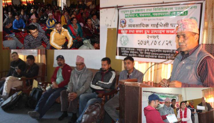 बर्दघाट–९ पञ्चनगरमा रहेको मधुवन कृषि बहुउद्धेश्यीय सकहारी संस्थाले भेट नेपालको प्राविधिक सहयोगमा चार दिने ब्यबसायिक गाईभैसी पालन तालीम सम्पन्न् गरेको छ । स्वर्णीम सामुदायिक विकास प्रतिष्ठानको सभाहलमा सम्पन्न् तालीममा बर्दघाट,सरावल,सुनवल लगाएतका क्षेत्रका ब्यवसायिक पशुपालन गरीरहेका सयबढि किसानहरुको सहभागिता रहेको थियो ।