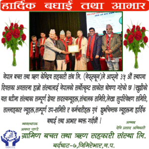 नवलपरासी जिल्लाको बर्दघाट–७ जिमिरेभारमा केन्द्रिय कार्यालय र अन्य चार स्थानमा सेवाकेन्द्रहरु मार्फत आफ्ना शेयर सदस्यहरुलाई सेवा प्रदान गर्दै आईरहेको यस संस्थाले एशियाली स्तरको एक्शेस ब्राण्ड, नेपाल स्तरको प्रोभेसन ब्राण्ड, नेफस्कूनबाट लुम्बिनी प्रदेशको उत्कृष्ट साकोस र राष्ट्रिय सहकारी बैंकबाट लुम्बिनी प्रदेशको उत्कृष्ट सहकारी, राष्ट्रिय सहकारी महासंघ बाट पश्चिमाञ्चल विकास क्षेत्रकै उत्कृष्ट सहकारीको रुपमा पुरस्कृत भईसकेको छ भने आर्थिक बर्ष २०७८/०८९ मा नेपालकै सर्वोत्कृष्ट साकोसको रुपमा पुरस्कृत हुन सफल भएको संस्थाका निर्वतमान अध्यक्ष तथा संस्थाका सल्लाहकार रविन्द्र बिक्रम हमालले बताउनु भएको छ ।