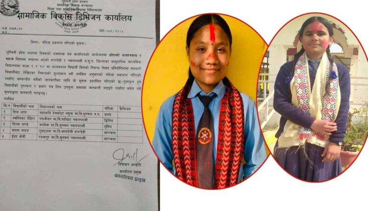 लुम्बिनी प्रदेश स्थापना दिवसको अवसरमा लुम्बिनी प्रदेश सरकार सामाजिक विकास मन्त्रालय शिक्षा तथा सामाजिक विकास निर्देशनालय अन्र्तगतको सामाजिक विकास डिभिजन कार्यालयले आयोजना गरेको प्रतियोगितामा जनसेवा मावि सुनवलकी दिब्या पाण्डे तृतिय भएकीछन भने लुक्ठहवा माबि मायादेवि रुपन्देहीकी सपना र रमवापुर माबि सुनवलकी ईशा क्षेत्रीले सान्तोना स्थान हासिंल गर्न सफल भएकाी छन ।