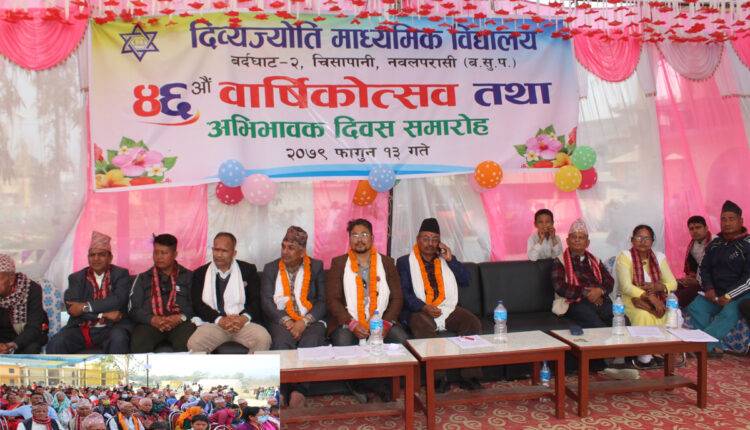 बर्दघाट नगरका सामुदायिक विद्यालयहरुलाई निजी तथा संस्थागत विद्यालयसंग प्रतिषप्रर्धा गर्ने गरी नगर अघिबढेको बर्दघाट नगरपालिकाका नगर प्रमुख शम्भुलाल श्रेष्ठले बताउनु भएको छ । आज दिब्य ज्योती माबि बर्दघाट–२,चिसापानीको ४६औं बार्षिकोत्षब तथा अभिभावक दिवस कार्यक्रममा बोल्दै नगर प्रमुख श्रेष्ठले उक्त कुरा बताउनु भएको हो ।