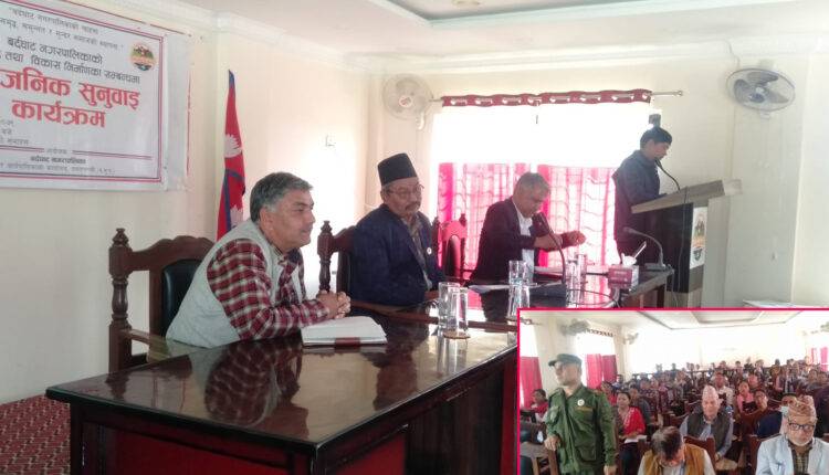 नवलपरासीको बर्दघाट नगरपालिकाले शुक्रवार सार्वजनिक सुनुवाई कार्यक्रम सम्पन्न् गरेको छ । बर्दघाट नगरपालिकाले आयोजना गरेको सार्वजनिक सुनुवाई कार्यक्रम जनप्रतिनिधि र कर्मचारीहरु बिचको मात्र सार्वजनिक सुनुवाई जस्तो भएको भन्दै वडाध्यक्ष तथा पत्रकारहरुले आलोचना गरेका छन् ।