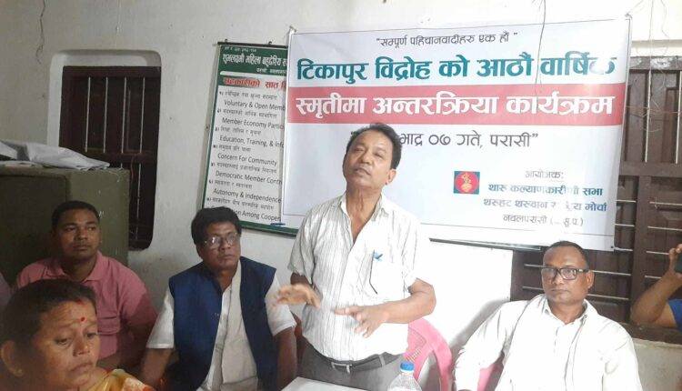 पश्चिम नवलपरासीका थारु समुदायले टिकापुरमा भएको घटनालाई आठौं बार्षिक स्मृतिको रुपमा मनाएका छन् । २०७२साल भदौ ७ गतेकै दिन कैलालीको टिकापुरमा भएको घटनाको आज ८ बर्ष पुरा भएको छ । सो अवसरमा थारु कल्याणकारीणी सभा र थरुहट थरुवान सयुक्त संघर्ष समिति नवलपरासीले शुक्रबार आज परासीमा अन्तरक्रिया गरेको छ