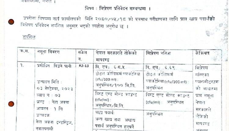 अक्वाले प्लान्टमा यु भी लाईट जडान गरी पुन पानीको नमुना संकलन गरी परिक्षणका लागि खाद्य प्रविधि तथा गुण नियन्त्रण कार्यालयमा परिक्षणका लागि पठाएकोमा पानीको रिपोर्ट राम्रो आएको हो । कम्पनीले बजामा पठाएको पानी गुणस्तर हिन भएको गुनासो आएपछि बर्दघाट नगरपालिकाले पानीको नमुना संकलन गरी परिक्षणका लागि भैरहवा स्थित खाद्यमा प्रविधि तथा गुण नियन्त्रण कार्यालयमा पठाएकोमा प्रति सय मिलिलिटरमा कोलिफर्मको मात्रा २१ भेटिएको थियो ।