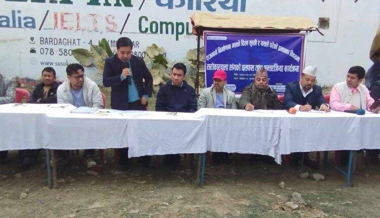 उपभोक्ता हित संरक्षण मञ्च बर्दघाट नगर समितिका अध्यक्ष हुमनाथ आचार्यले सडकका खाल्टाखुल्टीका कारण शिक्षकको निधन भएको दुखद स्मरणगर्दै,प्रदुषणका कारण मानव स्वास्थ्मा गम्भीर असर परेको बताउनु भयो ।