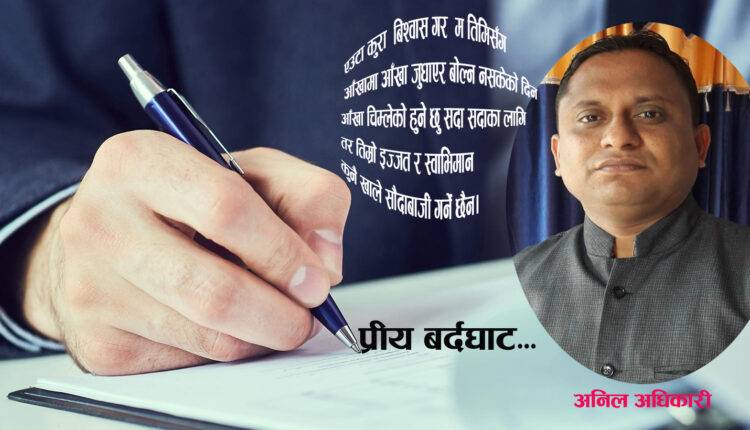 साच्चै बर्दघाट मैले तिम्रो रुपमा र तिमिसङ्ग प्राप्त हुने सुखको रहरमा तिमिसङ्गको प्रेम प्रती लालायित भएको होइन। म त तिमी भित्रका अनेकौ संभावना कुण्ठित भएको देखेर अनि तिमिमाथी भएका बारम्बारका चिर हरणका प्रयासले गर्दा तिमिलाइ बचाउन अनि तिमी हास्दा हास्ने तिम्रा परिवारको खुशिका लागि केही जोडबल गर्न खोज्दै छु। म पनि सायद तिम्रा परिवार खुशी हुँदा मात्रै खुशी हुन सक्ने भएकोले आफ्नो परिवार, काम र अन्य जिम्मेवारी छोडेर केही समय तिमिलाइ खास बलियो बनाउन र तिम्रो सार्थकता र पहिचानका लागि एउटा खास साथ तिमिलाइ दिन खोज्दै छु। मेरो प्रेममा यदि तिमी खोट देख्छ्यौ भने प्रष्ट भन म तिम्रो लागि आफुलाइ हरेक हिसावले सबल बनाउनका लागि तयार छु किन भने मैले तिम्रो वास्तविक संसार देखेको छु र तिमिलाइ तिम्रो गन्तव्यमा पुर्याउनका लागि मेरो भुमिका अहम छ भनेर मैले ढिलै भए पनि बुझेको छु र म त्यो जिम्मेवारी निभाउनका लागि अनेकौं ब्यबधानहरु सहनका लागि तयार पनि छु।