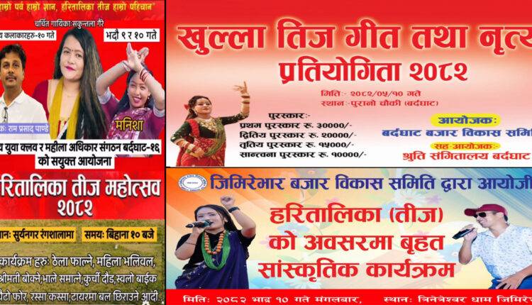 त्यसैगरी भोली भदौ ९ गते र पर्सी १० गते दुई दिनका लागि वडा नं. १६ मा रहेको सूर्यनगर रंगशालामा नव युवा क्लव र महिला अधिकार संगठन बर्दघाट–१६ ले संयुक्त रुपमा हरितालिका जीत महोत्सव–२०८२ आयोजना गरेको नव युवा क्लबका अध्यक्ष धनसिंह चिताउरेले जानकारी गराउनु भएको छ ।