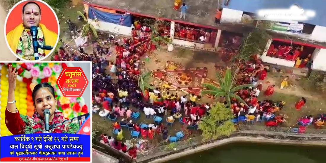 कार्तिक ९ गते देखि १५ गते सम्म ११ वर्षकी बालविदूषी सुश्री अनुराधा पाण्डेले श्रीमद्भागवत महापुराण कथा प्रवचन गर्नेछन । विनय त्रिवेणी गाउँपालिका वडा नम्बर– ६,त्रिवेणीमा “चतुर्मास सत्संग एवं महाभारत कथा प्रवचन तथा एक करोड दीप प्रज्वलन धार्मिक महामहोत्सव २०८२ सञ्चालन भैरहेको छ ।