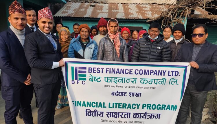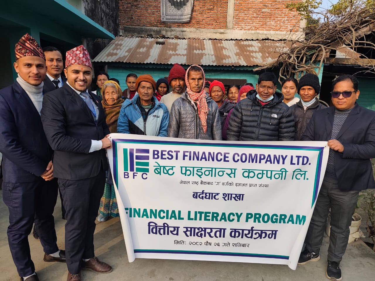 बेस्ट फाइनान्स कम्पनी लिमिटेड बर्दघाट शाखाले आज वित्तीय साक्षरता कार्यक्रम सम्पन्न गरेको छ । आफ्नो सामाजिक उत्तरदायित्व कार्यक्रम अन्तर्गत बेस्ट फाइनान्स कम्पनी लिमिटेड, बर्दघाट शाखाले प्रतापपुर गाउँपालिका वडा नं.–२, भिट्टा गाउँका स्थानियवासीहरुसँग वित्तीय साक्षरता कार्यक्रम गरेको थियो।