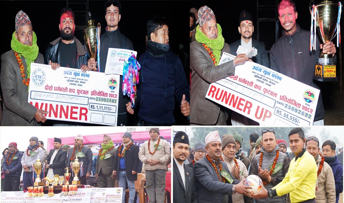 श्री उदय युवा क्लब ,बर्दघाट–१४, धर्मवस्तीले आयोजना गरेको उक्त प्रतियोगितामा प्रथम हुदै भुमही रिकन्डीसनल रु १ लाख ११ हजार १ सय ११ रुपैया नगद सहित,सिल,ट्रफि र प्रमाणपत्र हात पारेको थियो भने उपविजेता हुने भैरब स्पोर्टसले ५५ हजार ५ सय ५५ रुपैयाँ नगद सहित,सिल,ट्रफि र प्रमाणपत्रमा चित्त बुझाउनु परेको थियो ।