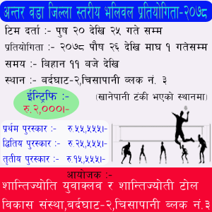 प्रवेश शुल्क १५ सय रुपैया लिएर टि–टि सिस्टममा खेलाईएको भलिवल प्रतियोगितामा प्रर्थम हुने समुहले ५० हजार नगद,सिल,प्रमाण–पत्र ,द्धितिय हुने समुहले ३० हजार नगद,सिल,प्रमाण–पत्र र तृतीय हुने समुहले ५० हजार नगद,सिल,प्रमाण–पत्र र मेडल पाउने गरी प्रतियोगिता आयोजना गरीएको थियो।